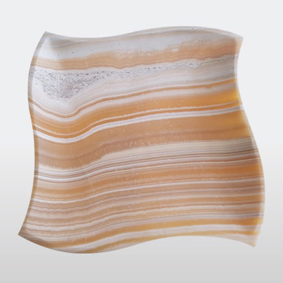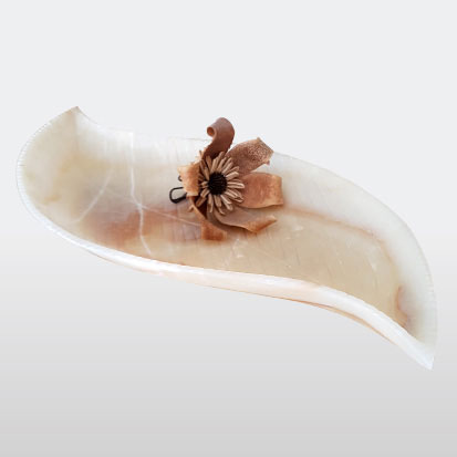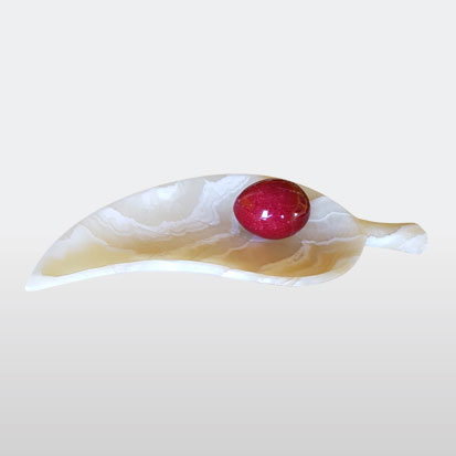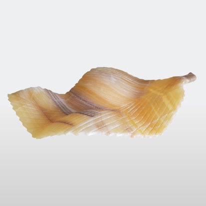 Diese sorgfältig geformte Blattform aus hellem Onixmarmor Blanco mit natürlichem gelbroten Ton ist eine geeignete Präsentierplatte jeder eleganten Einrichtung.