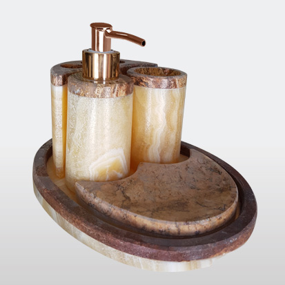 Das faszinierende Zusammenspiel der Marmorfarben Marmor Tabaco, Marmor Travertino Forito und Marmor Dorado zusammen mit dem schlichten abgerundeten Design zeichnen diese elegante Colon Linie aus.